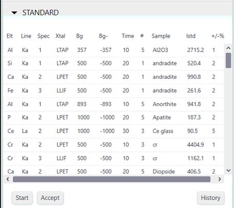 Opening the Standard Check tab populates a list of calibrations for the selected Calibration Method (it may be necessary to cycle through Methods to refresh the list). Only calibrations at the current beam HV are shown and only the most recent calibration for a particular element/X-ray line/spectrometer/crystal/sample is shown.