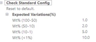 The ‘+/-%’ column indicates the acceptable % variation during the test. The values are dependent on sample composition and are saved in the SX ETU configuration. Default values are shown below:
