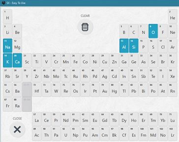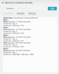 If a protocol for the analytical measurement does not exist, the Expert System 1) can create one with minimal input from the operator. The operator supplies a list of elements to be analyzed, along with an estimate of their concentrations. Use the Periodic Table display to chose the elements and adjust the expected concentrations with the sliders. Press the ‘Create Setup’ button to generate an analytical protocol. If the Calibration Method is set to ‘Geology’, oxygen is added to the element list. Its concentration will be calculated by stoichiometry.