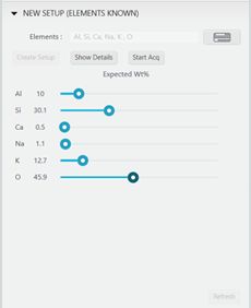 The ‘Elements’ display shows the list of elements to be measured or calculated. In the case of a pre-defined setup, the composition sliders cannot be modified.