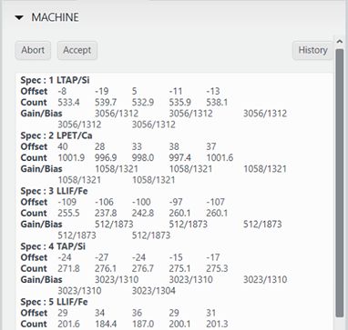 3. The spectrometers are verified (Fe, Ca, and Si for LiF, PET and TAP). The dynamic offsets are saved.