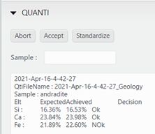 For each Calibration Method (Geology, Metallurgy, Sulphide and Other), a quantitative settings file and a representative standard sample are defined in the SX ETU Configuration. During the Quanti test, this sample is analyzed with the predefined setup. The results are compared to the expected concentrations. A pass/fail result is presented, which is dependent on the error specification defined in the SX ETU Configuration