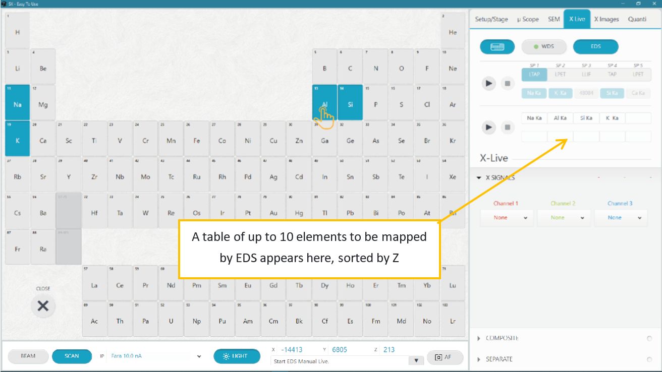 . Press on an element to add it to the EDS table. Press on the element a second time to remove it from the table.