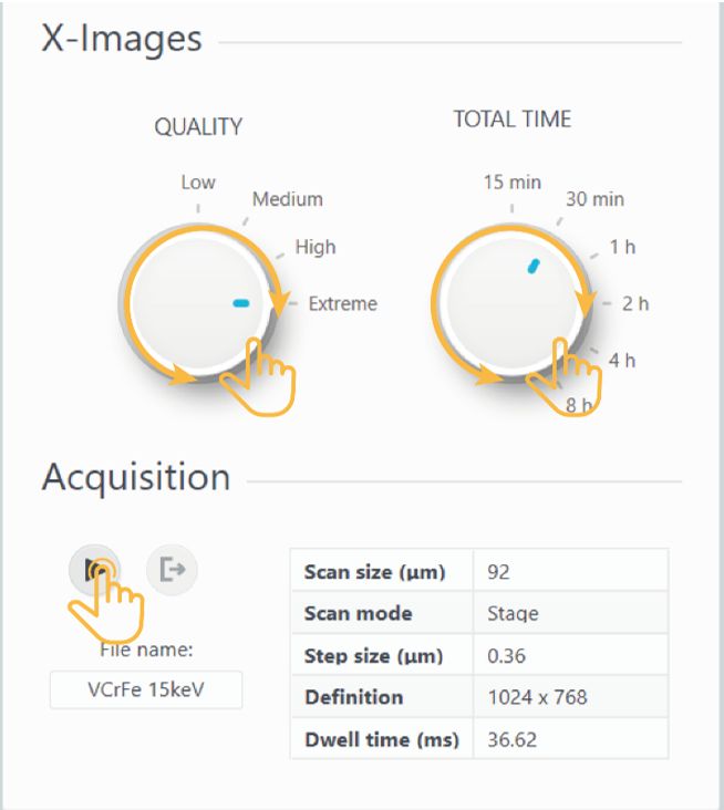 The lower portion of the X Images panel is dedicated to image parameter setup and acquisition.