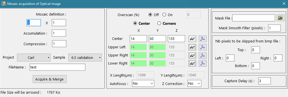By clicking on the Mosaic button, a pop-up window opens where the user can define the number of cells, the accumulation desired and the compression. The resulting file can be directly saved into a specific Project and a related Sample.