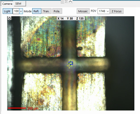 Focus can be manually set using the dedicated physical thumbwheel on the Control Keyboard. Otherwise, the ‘Z focus’ button enables an automatic optical focus of the sample in order to get the sample at the proper working distance. This ensures that the WDS is properly set on the Roland circle for the best X-ray detection.