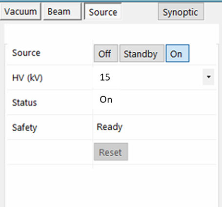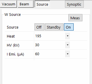 The tab is dedicated to source (W/LaB6/FE) tunning. As for the Beam sub-panel, the Control tab, allows setting up the source to ‘On’ or ‘Off’, selecting the Accelerating voltage, checking the status of the source, and influence other parameters of the beam settings.
