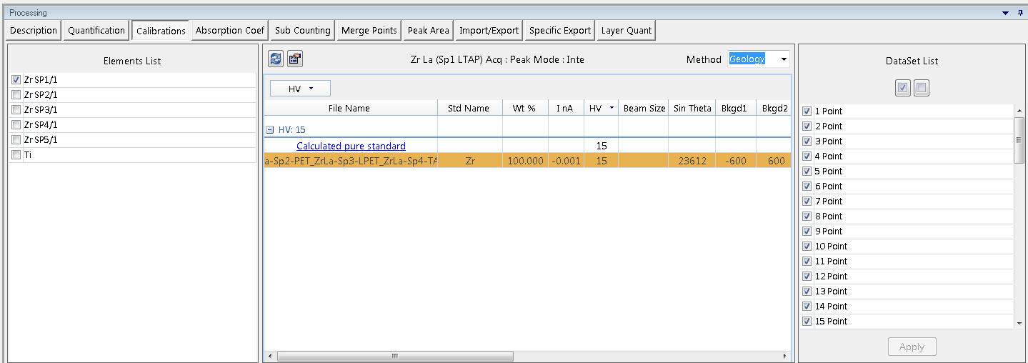 Allows the user to change the attached calibration file of each chemical element. After selecting an element inside the left-side list, users can select a new calibration file for this element inside the list of available calibrations and click on the ‘Apply’ button to start the calculation. As in the Quantification process, the modification can be only applied to selected datasets. Drag and drop column header into the light blue area to sort calibration files.