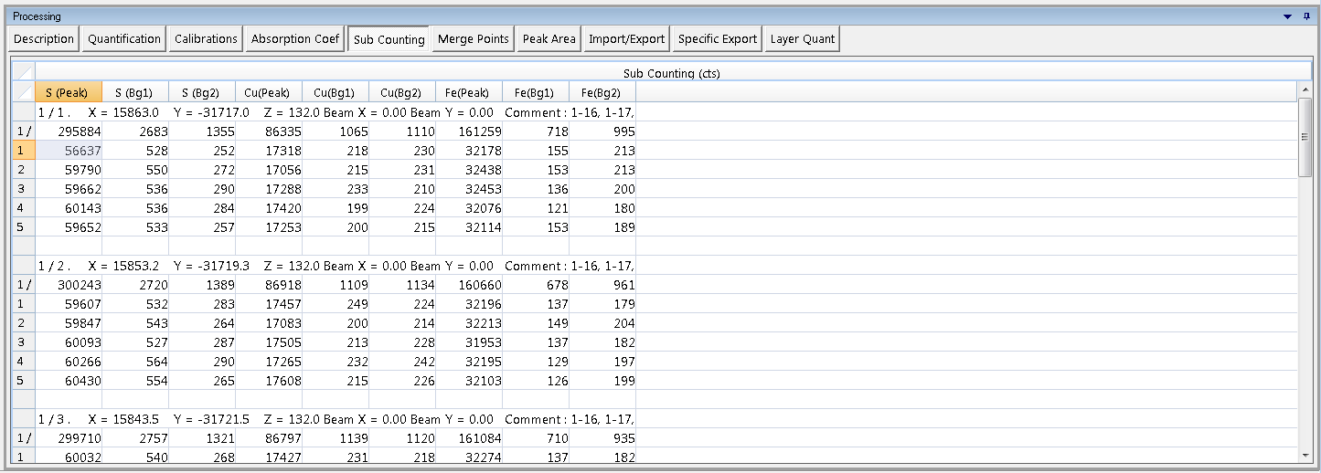 Remark: In the case where all the elements of a dataset have not been acquired using sub-counting option, it is necessary to display in the first column an element with sub-counting points. Otherwise the program won’t be able to initiate the calculation and remove sub-counting points.