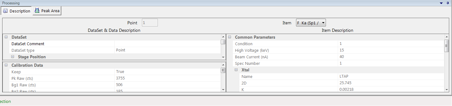 This sub-panel displays the settings and options defined together with the Calibration settings file through the SX-SAB – Settings. The ‘Item’ drop-down list allows the user to select the desired DataSet. Most of the information are read-only but some of them can be modified like ‘DatasSet Comment’ or ‘Stage Position’.