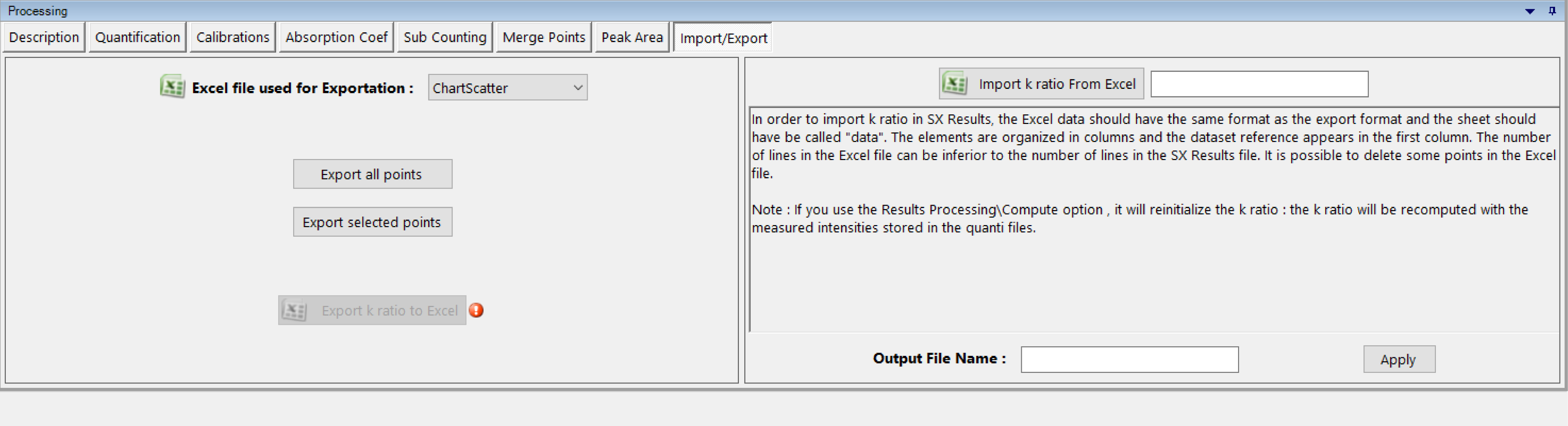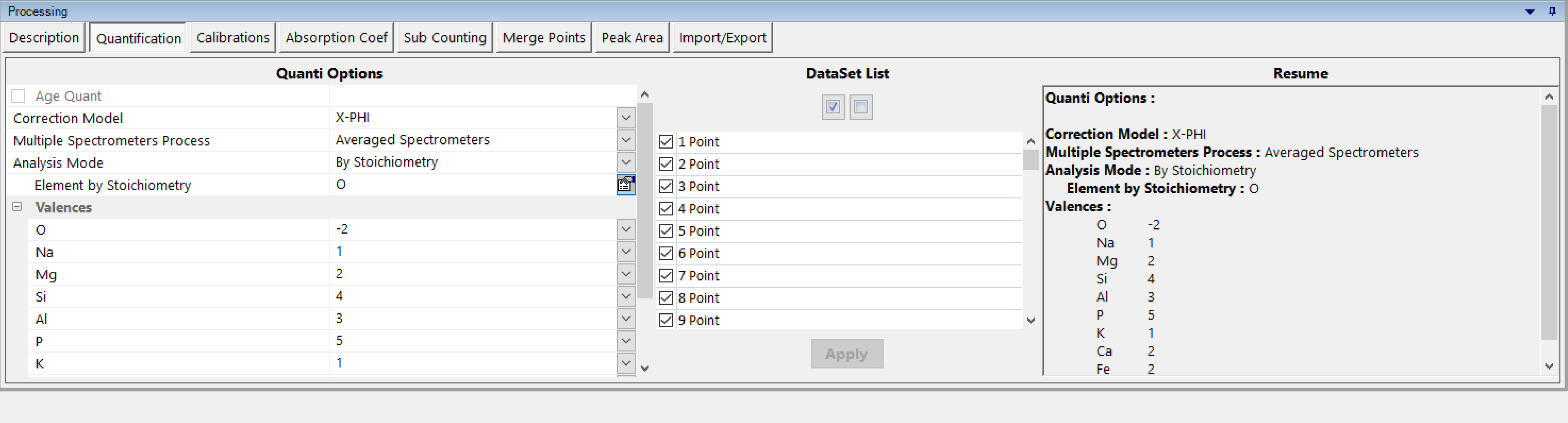 The Quantification sub-panel allows the user to modify the quantification options after the quantification setting definition. Parameters are exactly the same and all the required explanation can be found in the SX-SAB – Quantification Analysis section of this user guide. The modification of any quantification option enables the ‘Apply’ button. The DataSet list allows users to select the DataSet which will be affected by the new quantification parameters. Generally, it’s better to affect all the datasets with the same modification.