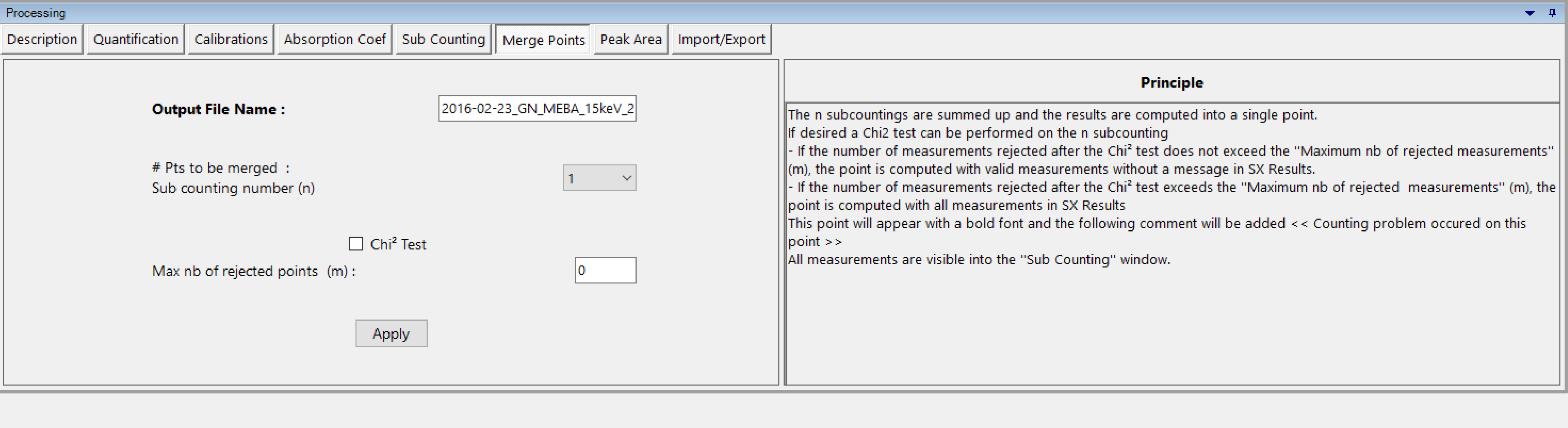 Merge points is a statistical tool that merges groups of similar analyses in order to increase the counting statistics (e.g., 10 analyses on the same homogenous sample). After typing the ‘Output Name’, users have to select the number of points to merge with the dedicated drop-down list. A Chi2 statistical test is also available. This test will reject some points that are too different from the rest of the sub-dataset. In this case the max number of rejected points can also be set.