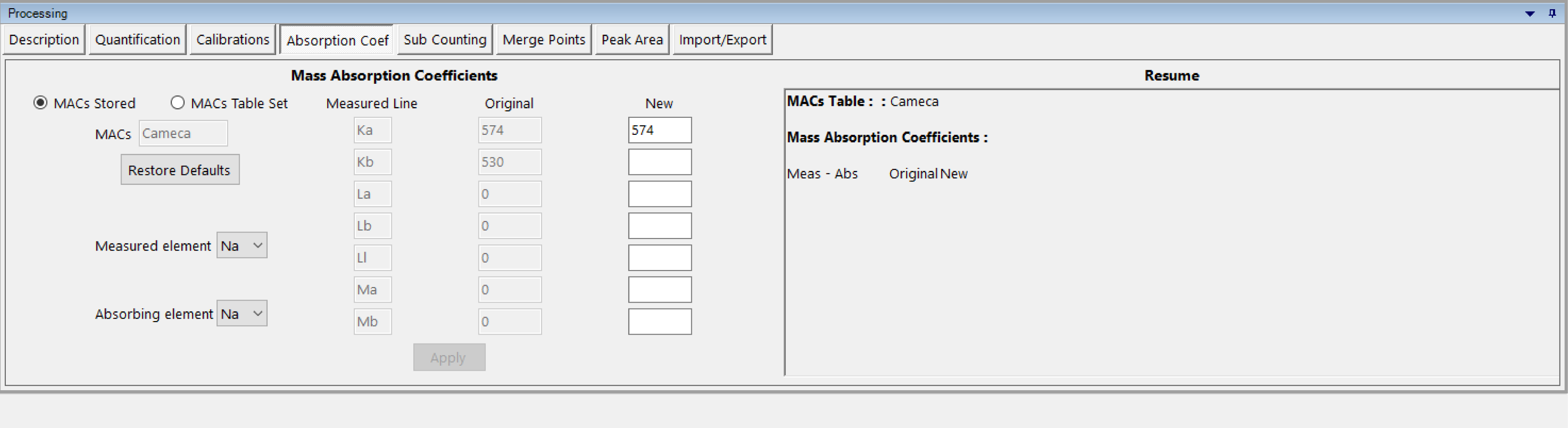 The mass absorption coefficients definition like those described in the MAC Set utility. These modifications are only related to the current file. Refer to the MAC Set utility section for detailed information.