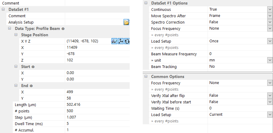 For any of the Data Type selected, the Dataset # and Common Options will be the same as shown above, with the exception of the ‘Beam Tracking’ option, only available whenever the ‘Beam position’ is of interest in the definition of the DataSet.
