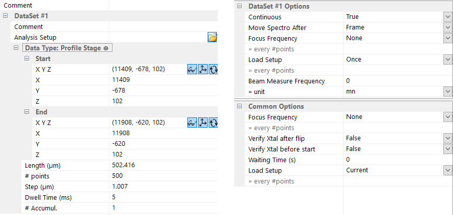 An alternative to using the [Line Beam] Data Type consists in using rather the [Line Stage] Data Type. Indeed, this Stage option allows as well to define ‘Stage Start’ and ‘Stage End’ locations with all (X, Y, Z) values indicated, and by choosing the number of points for the analysis, the ‘Step (µm)’ value is automatically calculated based on the total ‘Length (µm)’ analyzed. The added value of the Line Stage option resides in the ‘Profile Option’ sub-menu that allows [Non Flat Line] and [Variable Steps] choices.