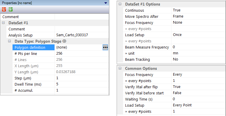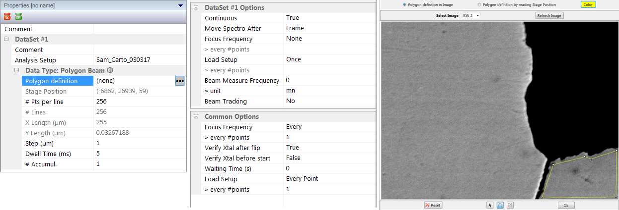 Another way to define the image area is to select a polygon. When the polygon mode is selected, a dedicated window automatically opens to define the size and the shape of the polygon. The two methods available to define the shape of a polygon are the Polygon by Stage and the Polygon by Beam. An example of DataSet # Option is provided below for the Polygon by Beam.