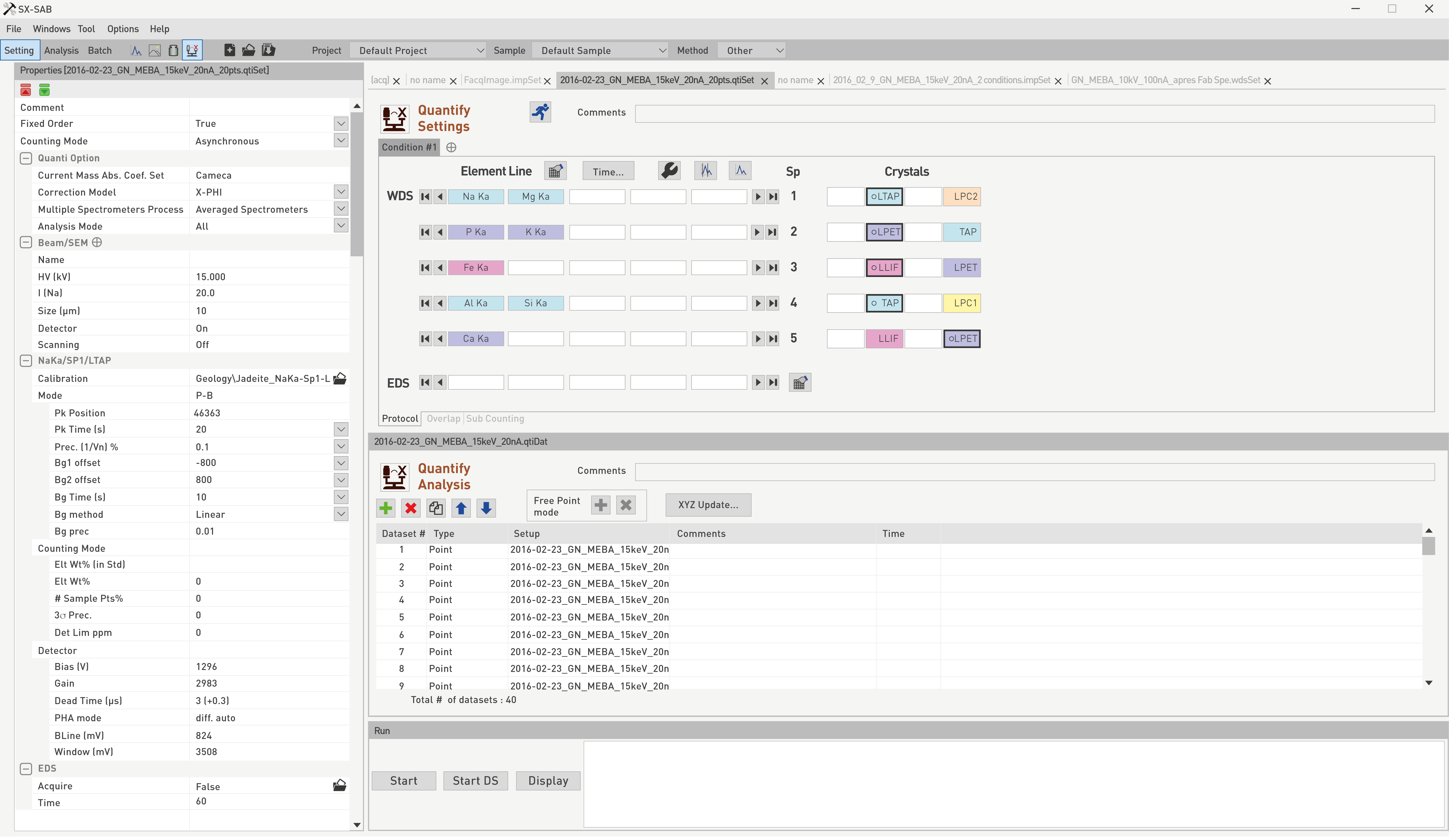 When points, lines, surface or mozaic were properly registered through the acquisition mode, analysis can be lauch with the SX-SAB Run panel. The run function is automaticaly dedicated to the current file openned in the analysis or batch windows above (see Overview part of this section for further information about SX-SAB window organization).
