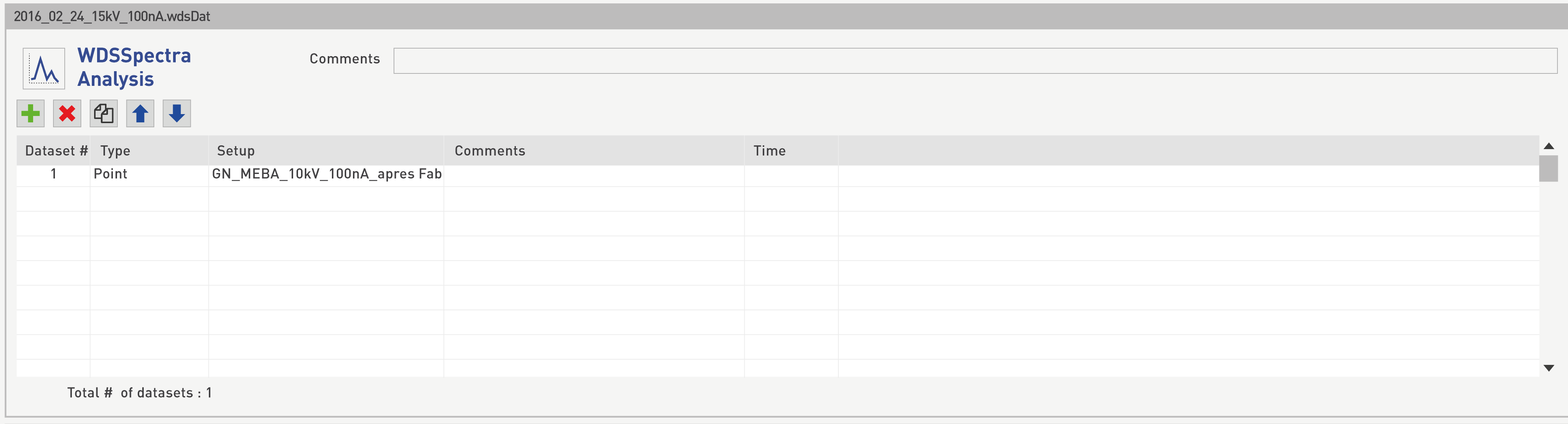 On the right hand side of the initial window layout of the WDS Spectra Analysis, users are provided with a table they can fill with a summary of Dataset #, pattern Type, « .wdsSet » Setup file, Comments and the automatically generated counting Time. Icons from left to right, concern the creation, deletion, duplication, and order of these datasets in the defined list.