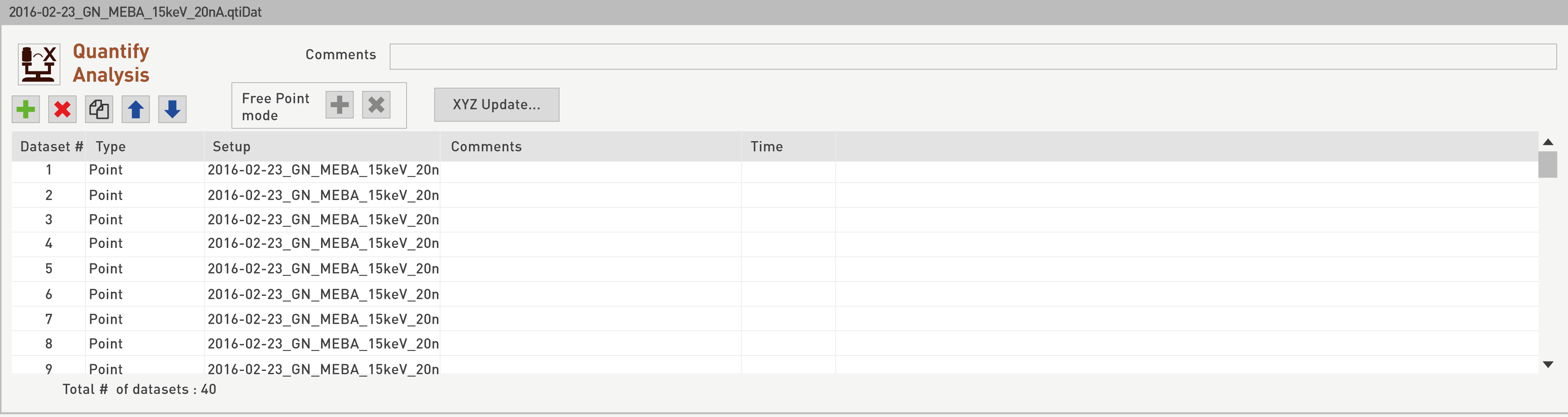 The DataSet # creation links a Quantify Settings file (« .qtiSet ») with a Data Type, which will translate into a total analysis Time. Within the ‘Quantify Analysis’ file organization, users may consider preparing several Data Types such as Points, Lines or Grids, based on Stage or Beam motions.