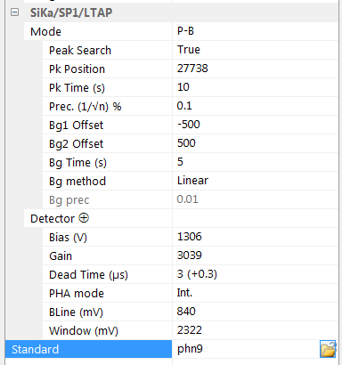When selecting ‘’Pk Area, users have to fill options dedicated to this mode such as the ‘# channels’ in the peak scan, the ‘Total Range’ which is the width of the peak in Sin θ unit, the background ranges (‘Bg range Left’ and ‘Bg range Right’) allowing the algorithm to determine a background shape, and finally a ‘Scan Time (s)’ representing the total counting time to scan the peak.