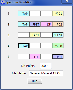 This function allows users to simulate WDS spectrum from the selected chemical elements. Results are displayed through the SX-Results program and can be treat as any WDS spectrum (see SX-Results chapter for more informations). User has to enter the Elt wt% before running the spectrum simulation.