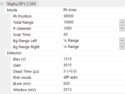 This mode can be used for the calibration of elements measured on the PC-type crystals when peak shifts and peak shapes differ between standards and unknowns. The measurement is based on the peak area and the user has to define the parameters of the area measurements.