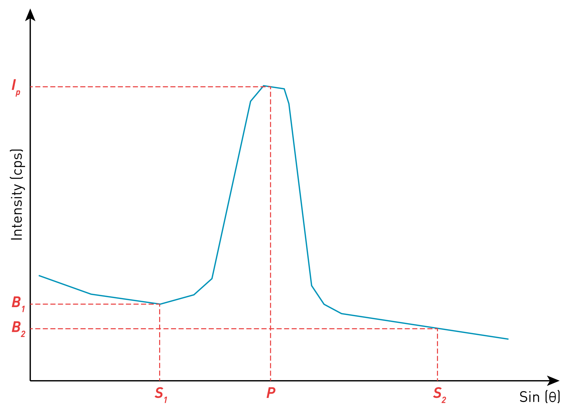 P is the peak position in Sin(θ) unit, where the peak intensity is maximum. The net intensity peak I is calculated by subtracting the raw intensity peak P and the background intensity B.