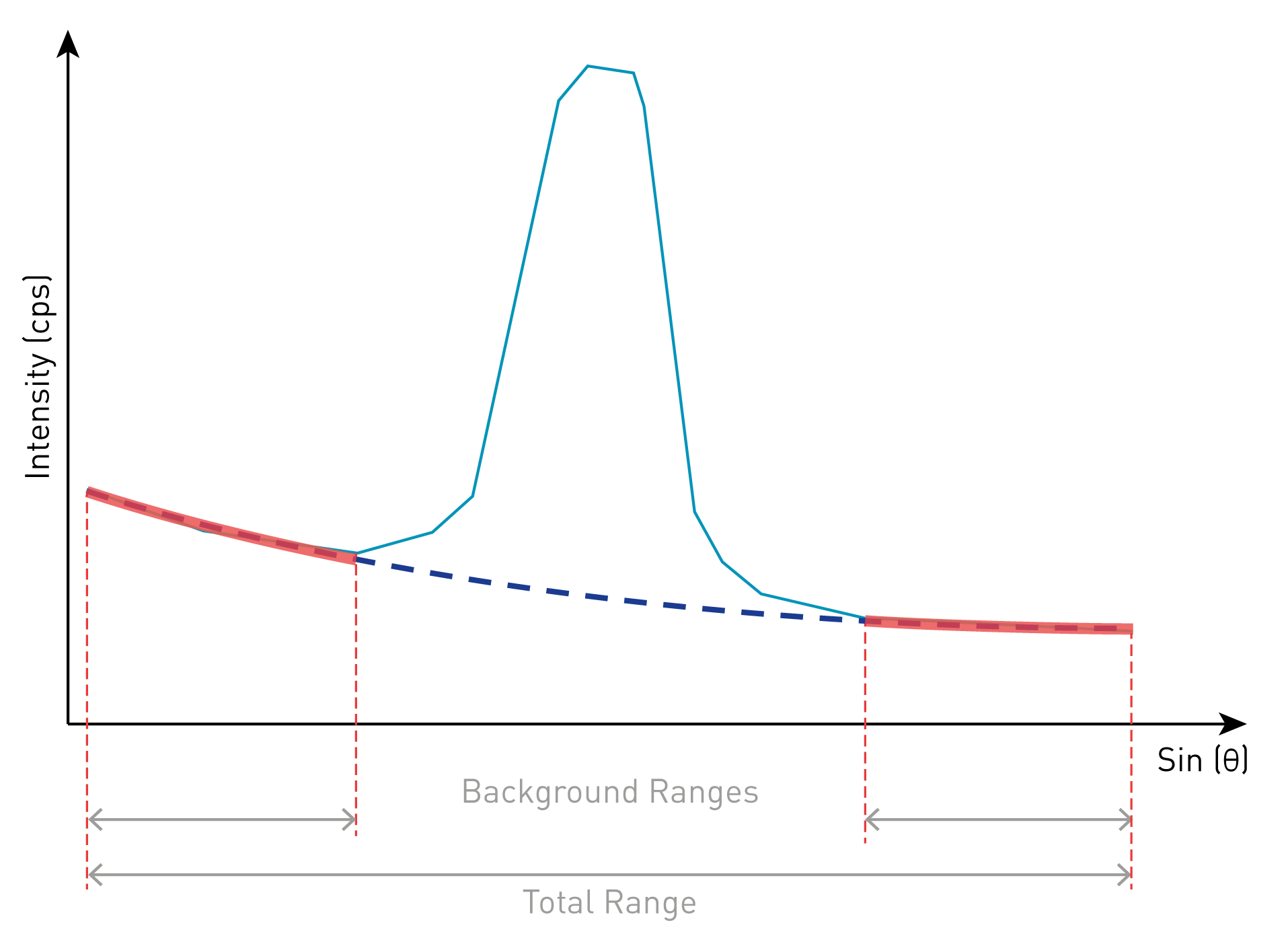 In the figure above, the blue curve corresponds to the acquired WDS scan, while the red segments (solid) delimit the background ranges and the blue curve (dash) represents the background fit. Under this configuration, the effective (net) peak area is contained by the area above the blue curve, while the area below it is considered as background.