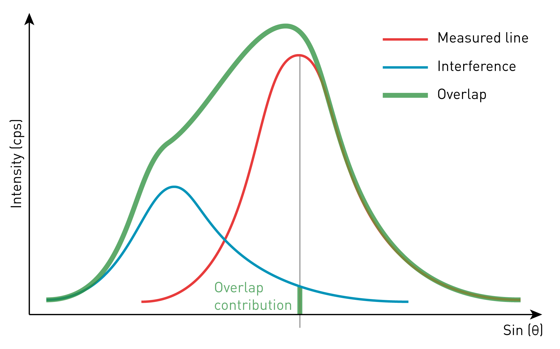 The intensity of the overlapping lines measured during the setup definition, is corrected with respect to the matrix effect of the standards, using the X-Phi procedure. During the quantification procedure, the concentration off the unknown sample is calculated in first approximation with the interference. The final interference intensity is suppressed from the overlapped line.