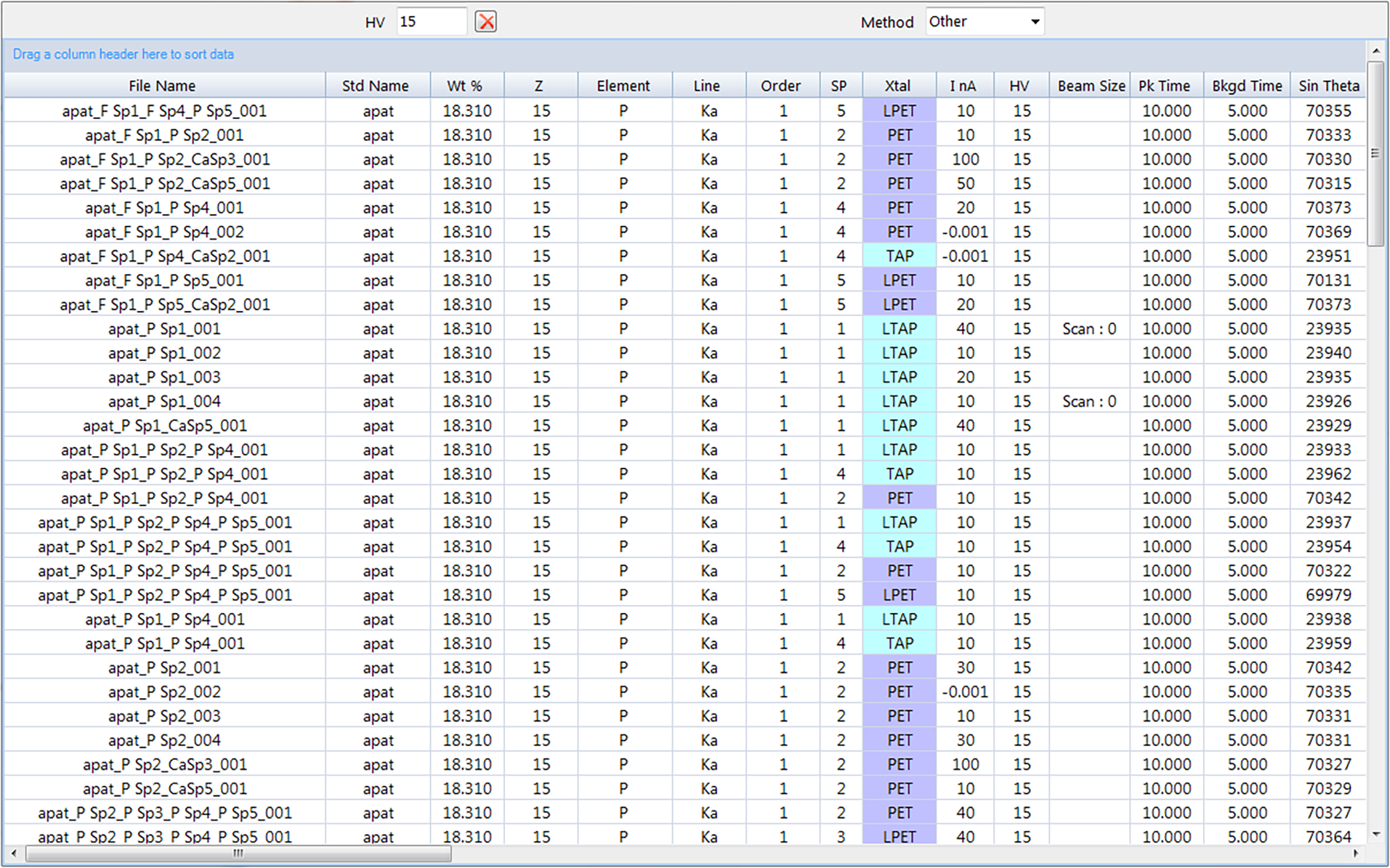 ‘Quantify Settings’ files need to be paired to ‘Calibration’ files where parameters for the elements of interest would have been well established. In figure above for instance, the element F will be probed and all the calibration parameters such as spectrometer, crystal, Method, Beam Conditions, WDS conditions, Detector conditions and Background models are readily accessible through an ‘Open File’ icon. Users can drag and drop column header to sort data.
