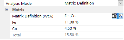 The figure below indicates that the [Matrix Definition] option is active with minor elements compared to the main matrix of elements constituting the material of interest. The matrix composition has already been entered and could be as close to 100 wt.% as one wishes. In other words, there is no minimum threshold required for the trace elements entered.