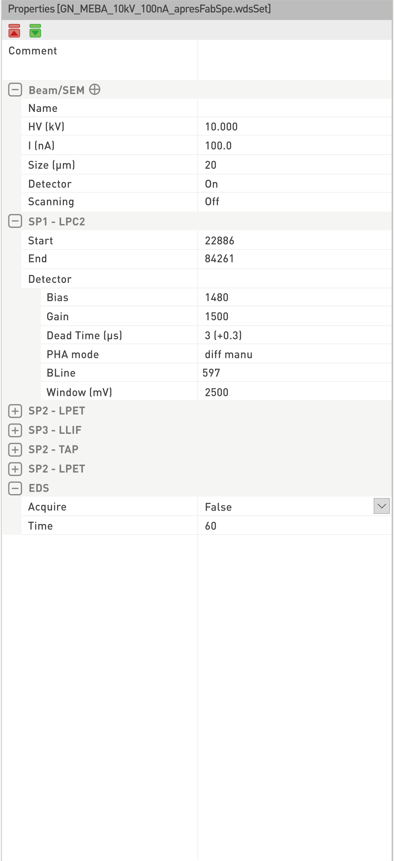 With the Flash options, one could directly apply the current Beam/SEM conditions to this Properties panel, while the Select options will fetch previously stored conditions that could then be loaded, read, and finally applied by clicking on the dedicated icon.