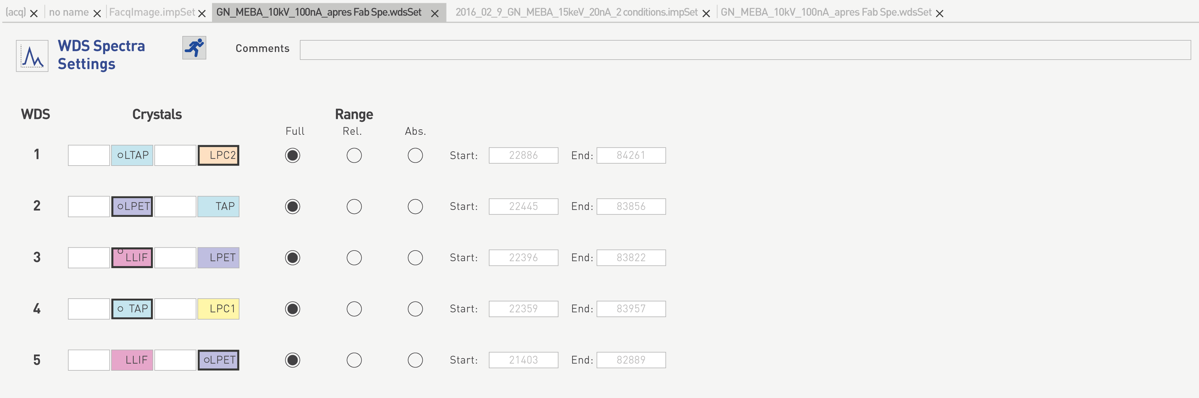 If the ‘Full Range’ option is selected for a chosen spectrometer and crystal pair, then the WDS scan will occur on the entire spectrometer range.