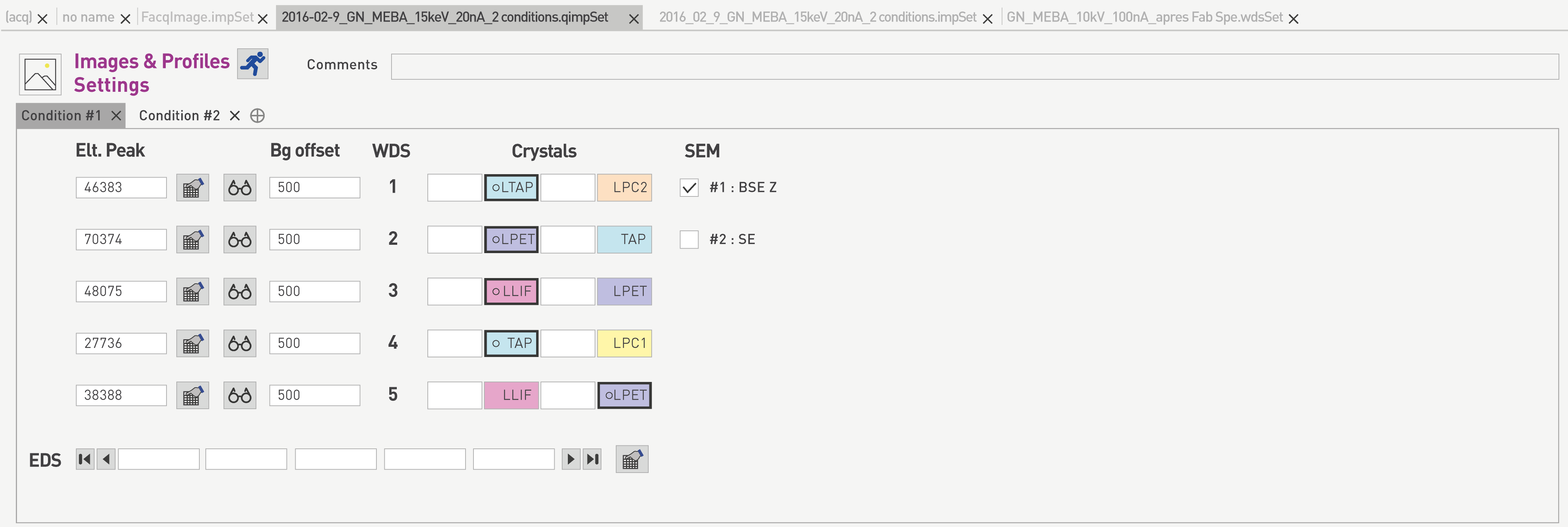 Default window will display on the left hand side, a ‘Properties’ panel with the chosen name for the file where several parameters such as Beam/SEM, X-ray line, Spectrometer # and Crystal type, and EDS are listed. These parameters are defined as part of a ‘Condition’. On the right hand side, an ‘Images & Profiles Settings’ panel allows the selection of a specific X-ray line, background offset, crystal type for each spectrometer as well as the detector type used in the SEM, as illustrated below.