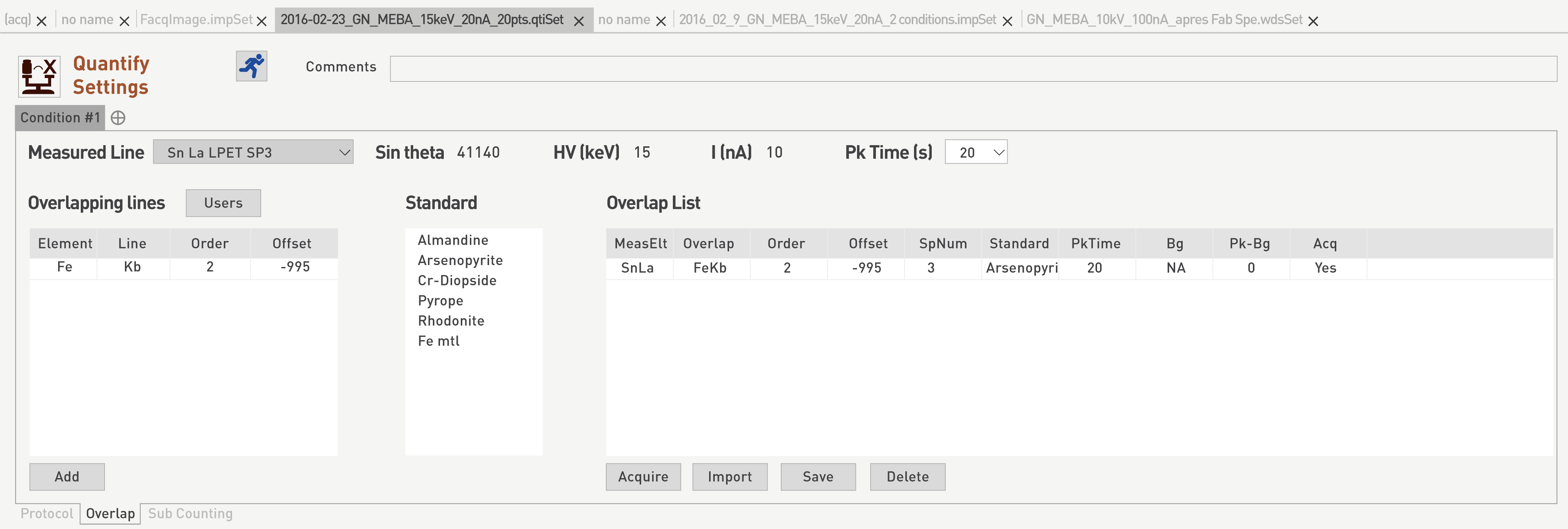 Another well-known issue encountered in EPMA during Calibration and Quantification concerns the overlap between closely positioned peaks. In order to compensate for this issue into the analytical process, a special tab ‘Overlap’, leads to an additional menu under the Quantify Settings panel.
