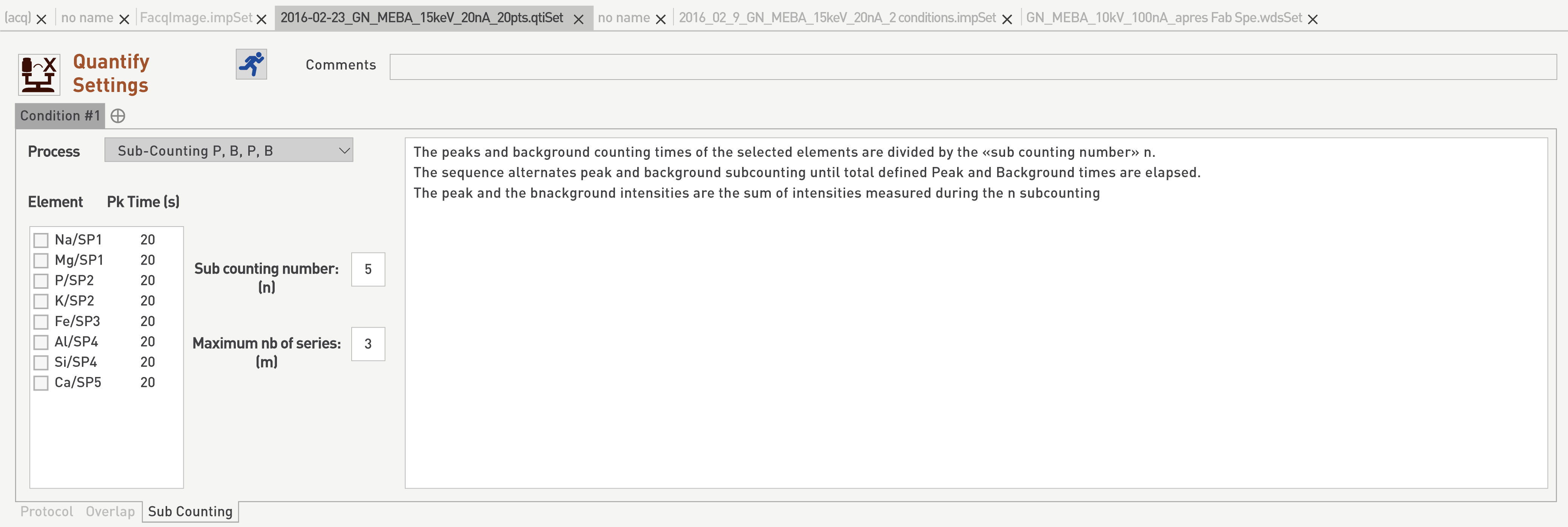 Peak and background counting times of the selected elements are divided by the ‘Sub counting number’ n. The sequence measures n sub-counting on the peak followed by n sub-counting on the background until the total defined peak and background times are elapsed. Peak and background intensities are the sum of the intensities measured during the n sub-counting.