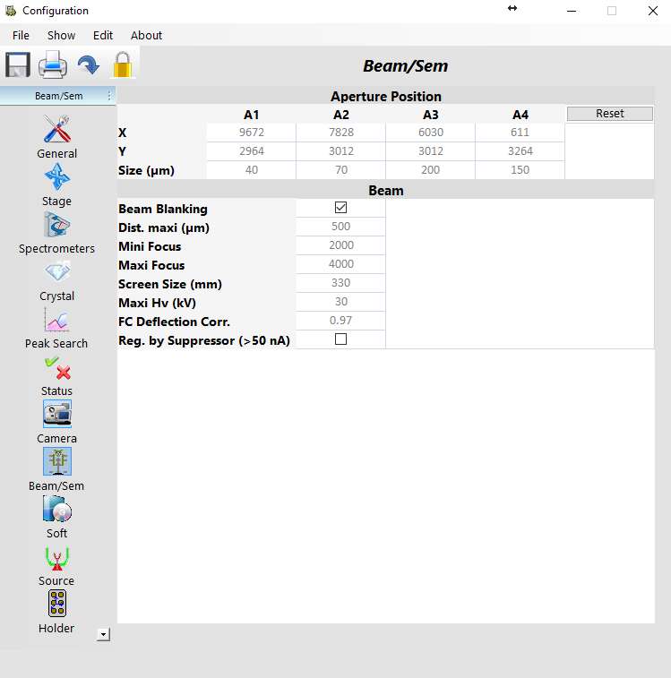 The Aperture Position and Beam parameters are accessible through the Beam/SEM tab which can be opened by clicking on the dedicated icon.