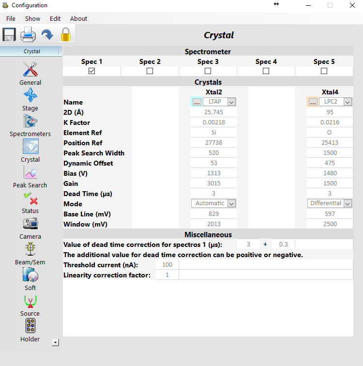 Detailed information on crystals used in conjunction with each spectrometer can be accessed by clicking on ‘Crystal’ tab.