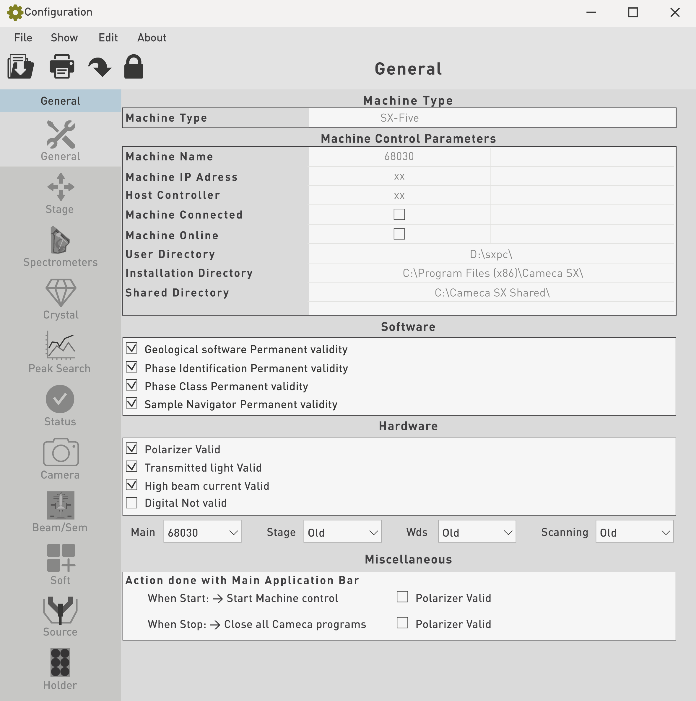 The Configuration is the third application from the Utilities tab in PeakSight and probably the most extensive one as it contains 11 sections. This important panel defines and controls many critical hardware parameters, some of which are tuned only by CAMECA trained personnel such as Field Service Engineers (FSE) and Applications Engineers (AE), while others could be changed by the users themselves.
