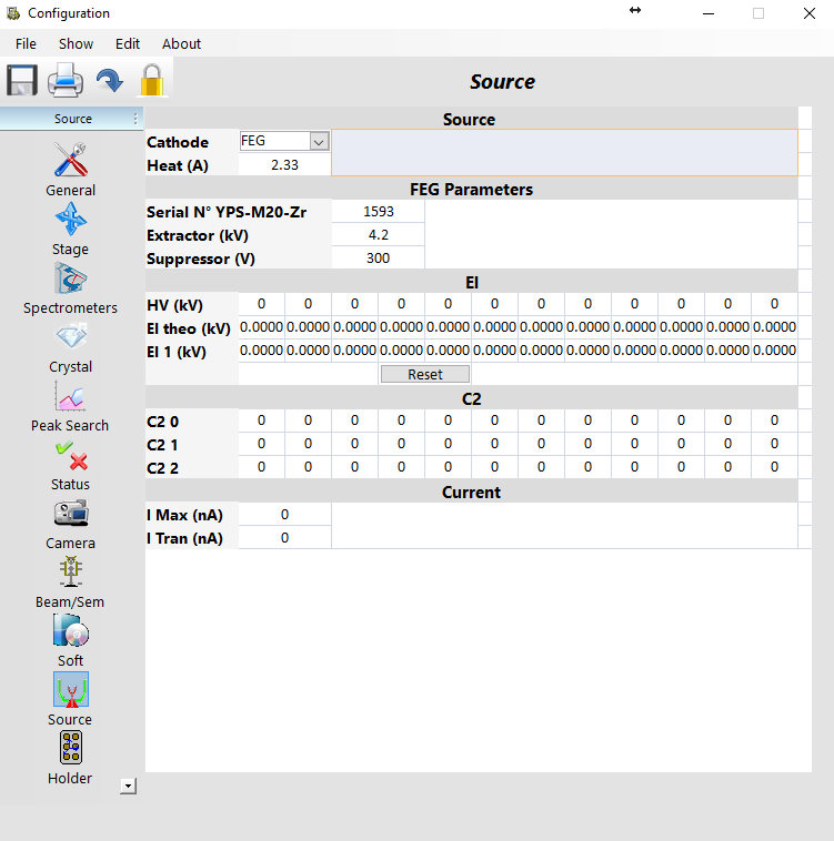 If a FEG source is present, then additional parameters such as the ‘Serial N° YPS-M20-Zr (Number)’ of the tip, the ‘Heat current (A)’, the ‘Extractor value (kV)’ and the ‘Suppressor value (V)’ need to be set.