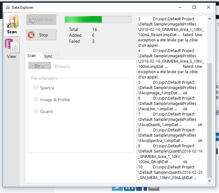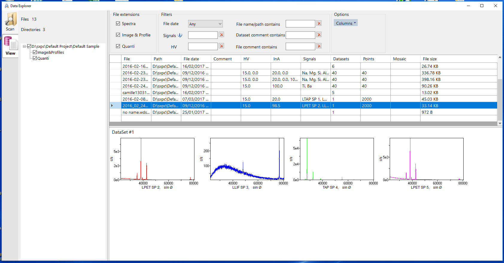 The files that can be scanned throughout selected directories and then viewed have extensions specific to either Spectra, Image and Profile or Quanti. An example has been provided below for the search and display of WDS Spectra. By highlighting a specific file or dataset, here with the « .wdsDat » as an extension, the images associated with this file are directly displayed so that users could quickly visualize them.
