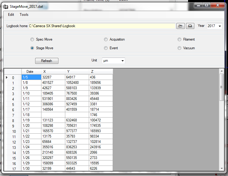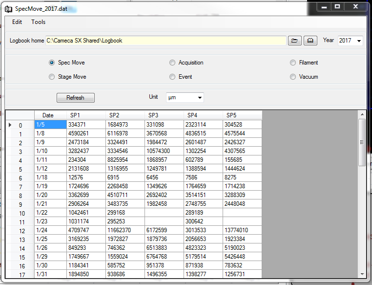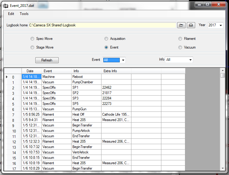 The Logbook allows a monitoring of the instrument overtime by recording parameters defined as Spec Move, Stage Move, Acquisition, Event, filament and Vacuum, as shown in figure above.