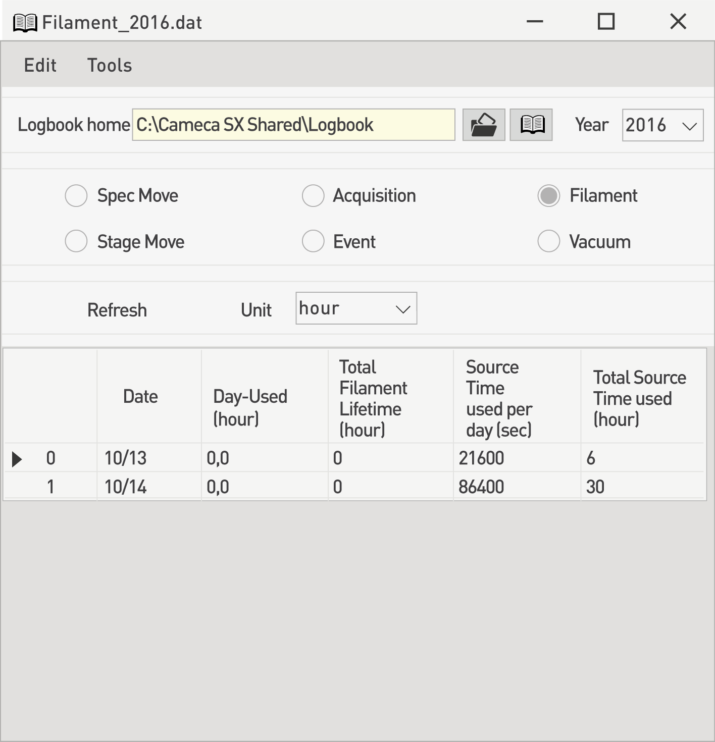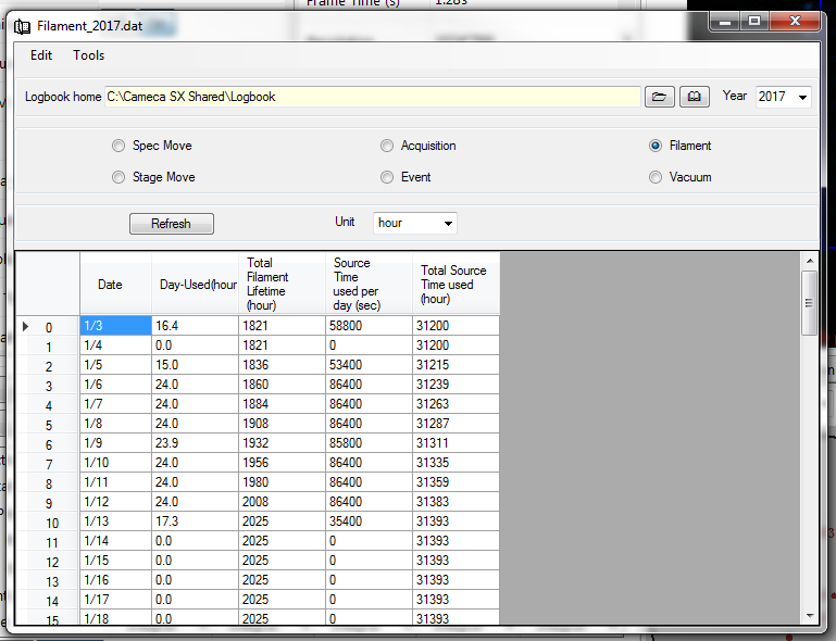 In addition to the Filament parameter belonging to the Event function, a more dedicated Filament function is available as shown below. Data are stored according to the «Filament_Year.dat» name and offer a detailed account of the effective time usage of the filament and of the electron source.
