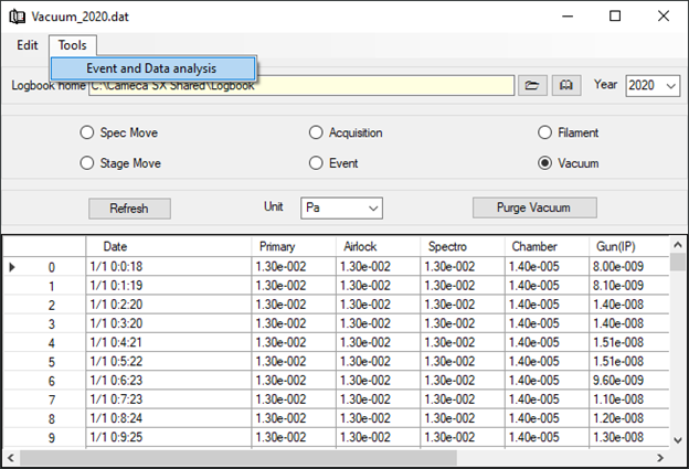 The frequency of the vacuum measurement is 10 minutes by default. This value can be modified in the Configuration program (Logbook Control), using the ‘Soft’ tab (when the configuration edit mode is enabled). The pressure Unit is left to the users’ preference in Pa, Torr or mBar. The vacuum table can be partially reset using the ‘Purge Vacuum’ button. This function delete redundant pressure values when they are constant through time.