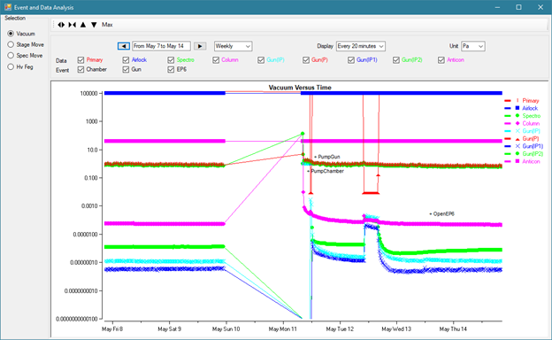 Selecting the item ‘Event and Data analysis’ under the Tools menu opens a window to graphically display vacuum values, stage movement, spectrometer movement, or FEG parameters (if equipped) versus time. These graphs are useful for instrument trends and troubleshooting.