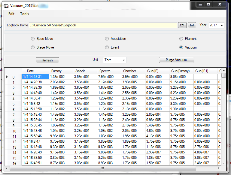 All pressures measured in each part of the instrument are stored in the Vacuum function of the Logbook in a file named «Vacuum_Year.dat», as illustrated below.