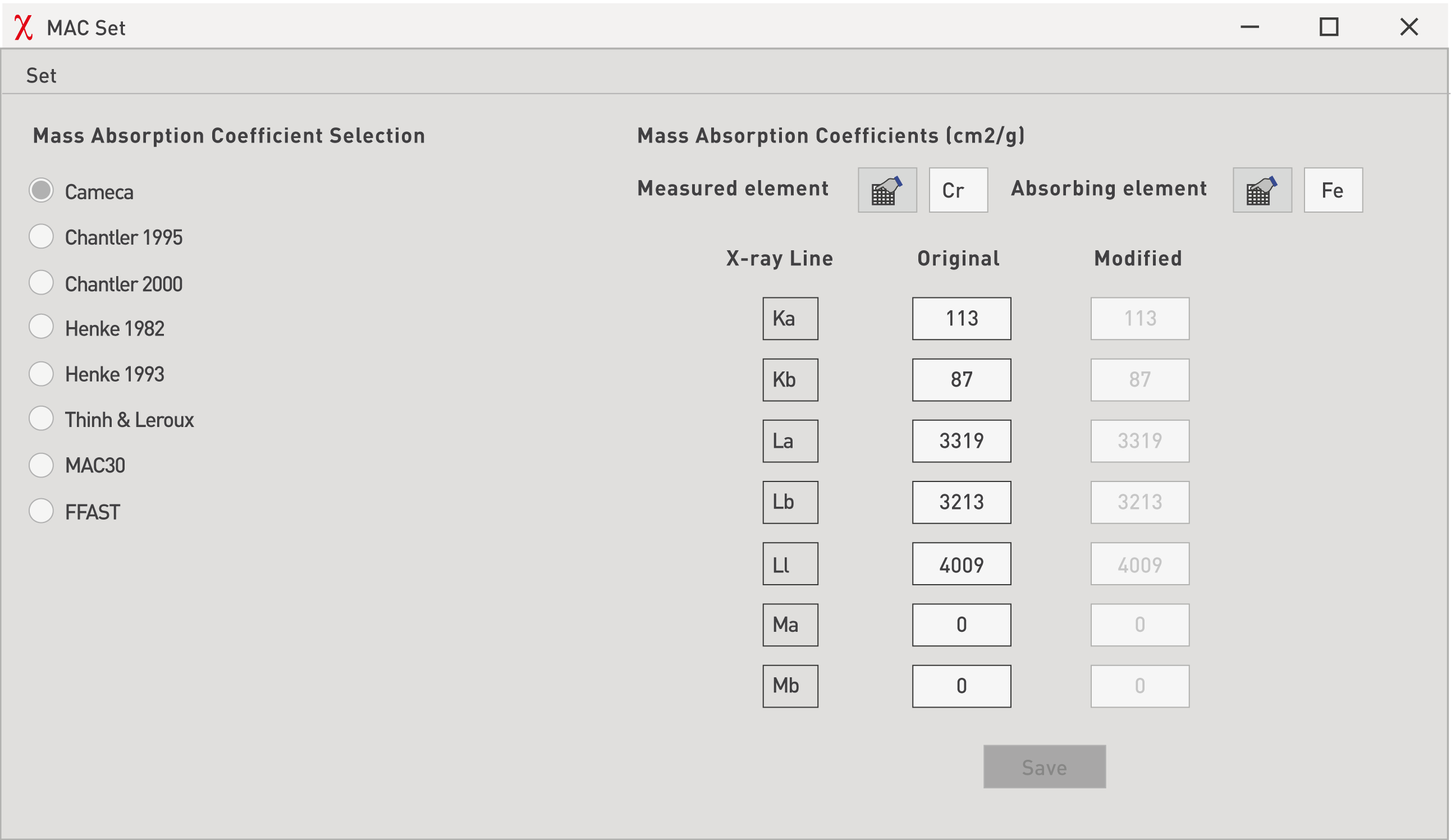 The MAC Set (MAC standing for Mass Absorption Coefficient) Utility enables the calculation of the mass absorption coefficient of the substrate or matrix as a function of the element to be measured. To open the program, click on the ‘MAC Set’ button in the SX-AppBar.
