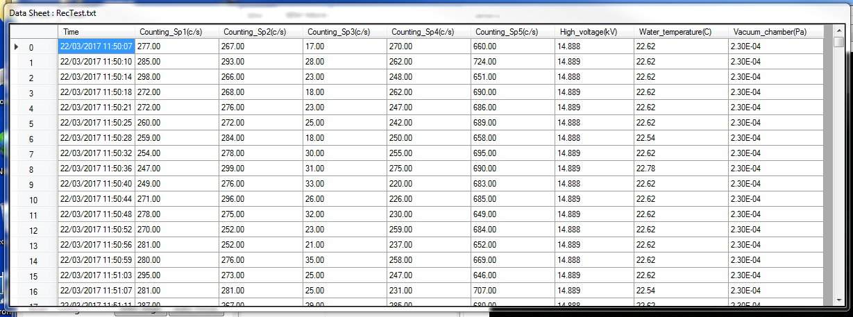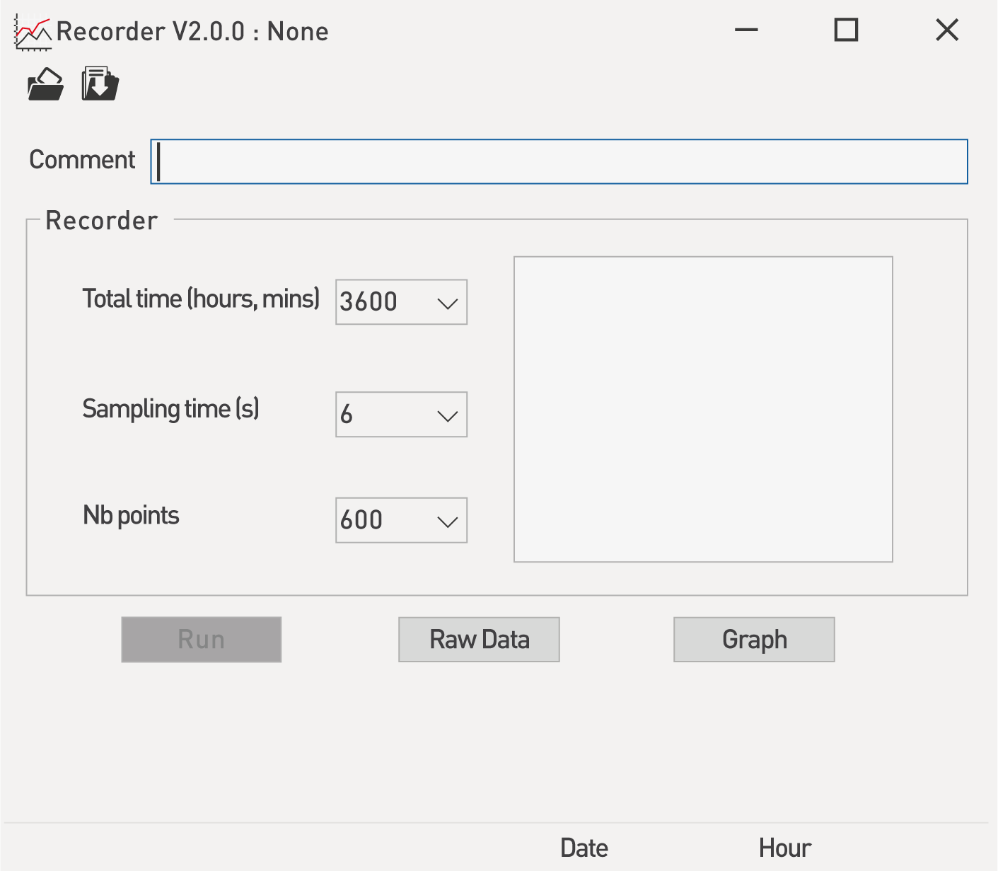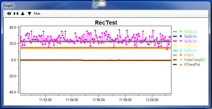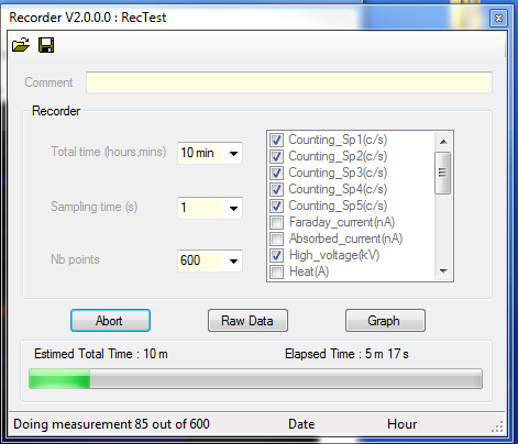 The Recorder allows service engineers to monitor all raw data gathered on the instrument, whether it concerns the counts on each individual spectrometer, the current read by the Faraday cup, the sample or delivered by the electron gun for instance. Stored information can be recalled by opening a recorder description file with the ‘.rec’ extension using the ‘open file’ icon, as shown below.