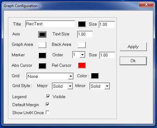 A manual setting of the X or Y scale can be reached through a double-click on each of the axes. The ‘Axis Configuration’ window appears and allows adjustment of the axis scale by typing the desired values. For display purposes, both scales can also be hidden by unselecting the ‘Visible’ checkbox.